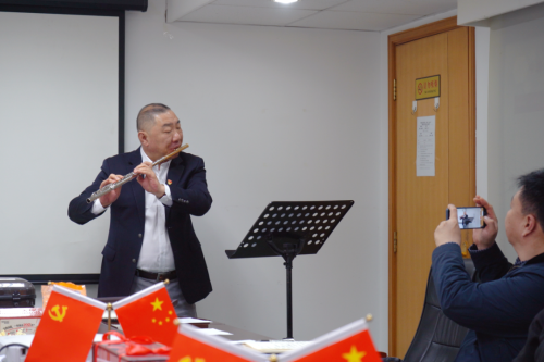 乐队支部书记、长笛声部首席程晓华同志现场演奏并讲解了贺绿汀创作的《牧童短笛》。同一首曲目,他采用单纯按谱演奏和融入情感演奏两种方式向大家进行了呈现,前者平平无奇,后者鲜活立体,用最直观的方式让大家明白,艺术家不仅仅是按照乐谱准确无误的表演,而是要融合自己对作品的理解去精心雕琢。通过不同的演绎方式,生动体现了文艺作品的创作应有真情实感,需要有时代的温度,而不能只是一种肤浅单薄的形式符号,要反映普通老百姓心底对党、对国家、对生活的真诚热爱。